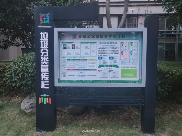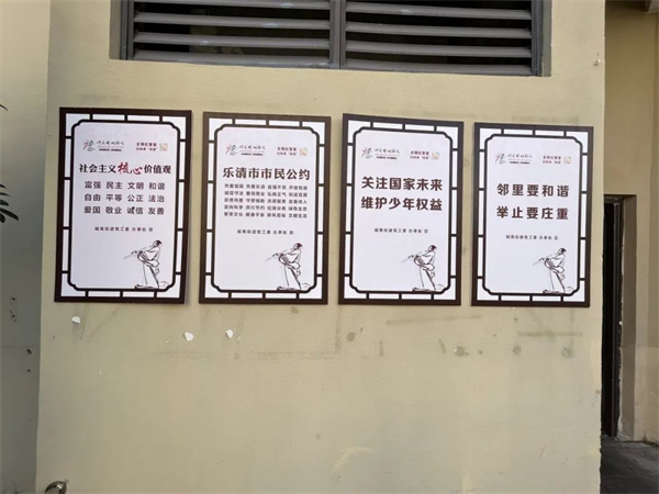 規格統一,色調一致,公益廣告干凈整潔,小區的文明程度,折射出我們城市的文明程度,人才大廈、天豪公寓的各個角落充滿著“公益宣傳好”的影子。